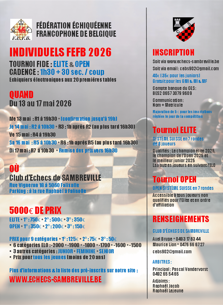 📝 Inscription via ChessTide : INDIVIDUELS FEFB 2026 ou par email :